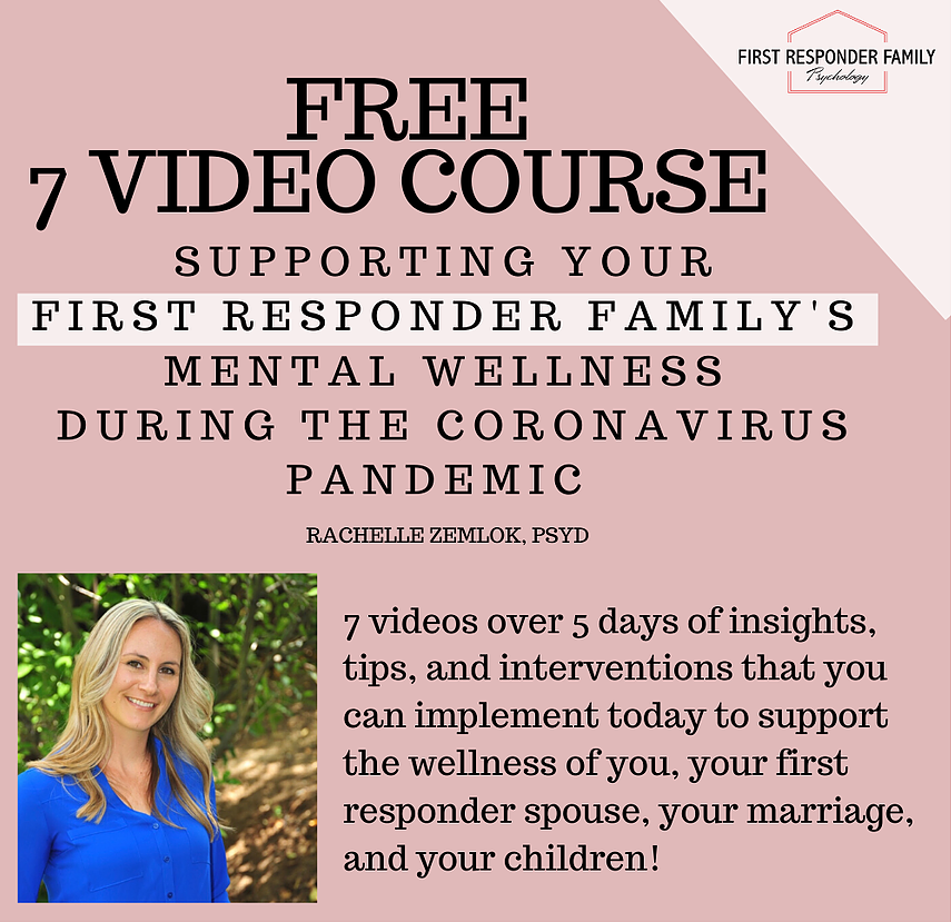 As a licensed child and family psychologist specializing in first responder families I have so much information that I’d like to share with first responder spouses during this very uncertain time. I realized it would take me forever to write it all up so I decided to record some short videos going over the most important insights and tools that I think will help support you as a spouse. I created this FREE 7 video course for first responder spouses that will be sent to you over 5 days allowing you time to implement interventions discussed. The videos share insights, tips, and interventions that you can implement TODAY to support the wellness of you, your first responder spouse, your marriage, and your children.