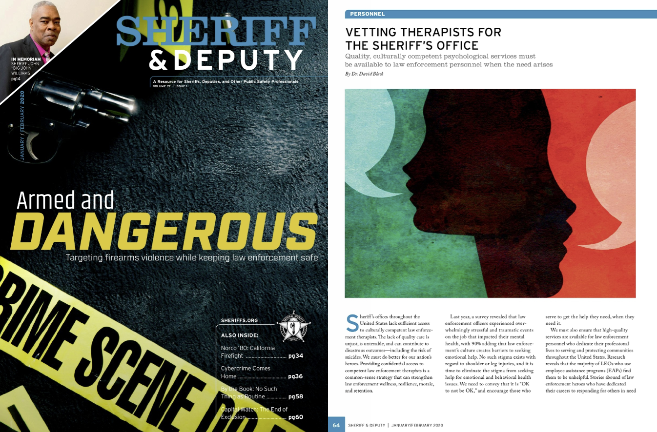 Cordico CEO, Dr. David Black, wrote the article “Vetting Therapist for the Sheriff’s Office” that was featured in January / February 2020 issue of Sheriff & Deputy Magazine. The digital version of the magazine can be found here. The text of the article is listed below.